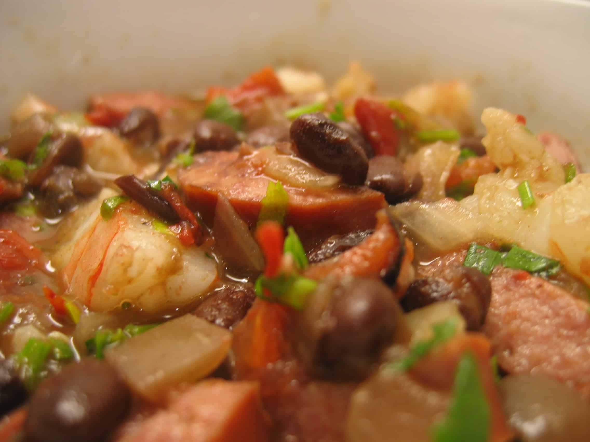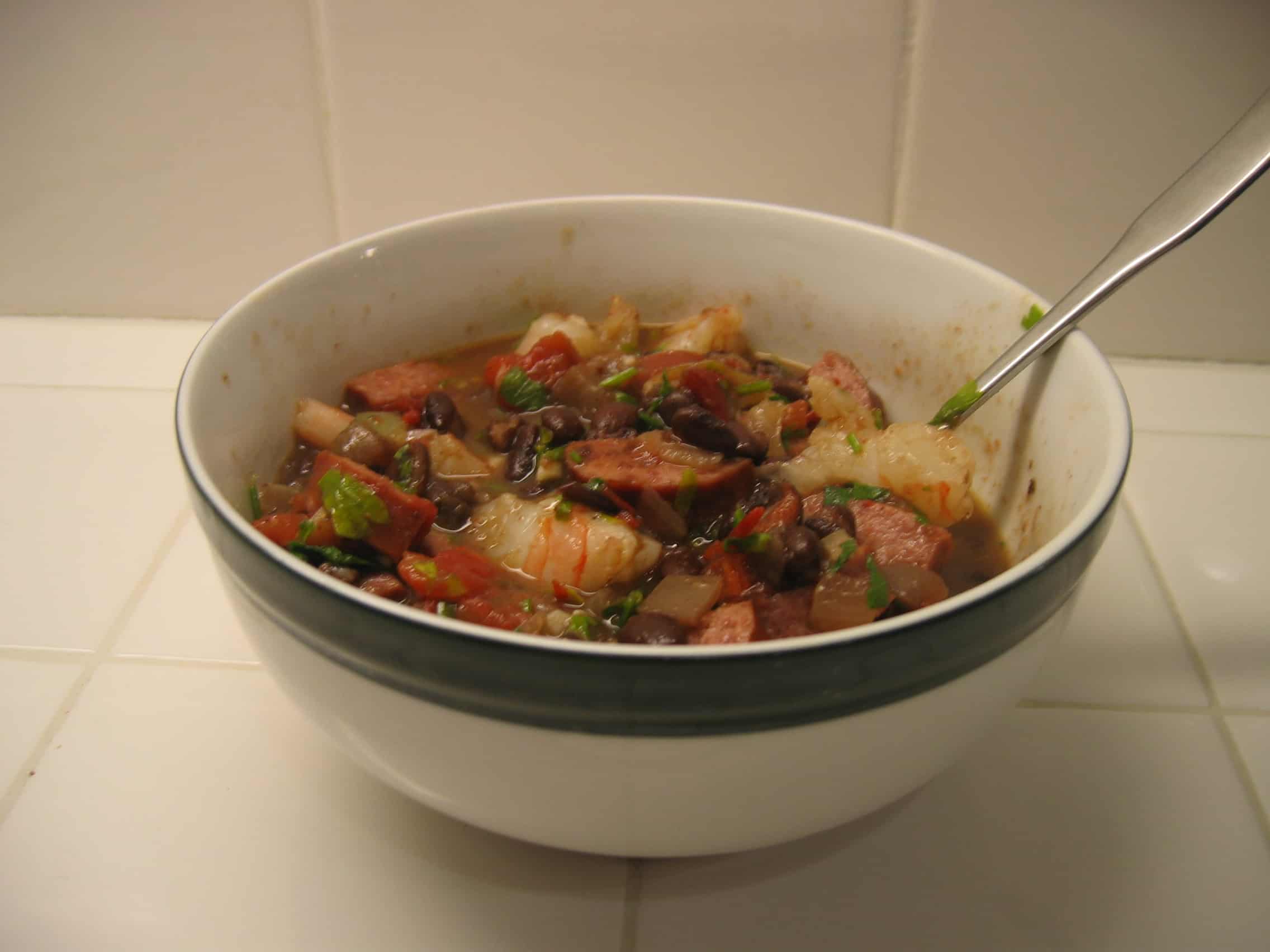 Fry sausage and onion in olive oil until it is browned. Add tomato and cook for another 5 min. Add the black beans and heat through until simmering. Add the shrimp and parsley to your bowl. Add the garlic to the beans and cook another 2 minutes. Add the bean stew to your bowl and mix well.